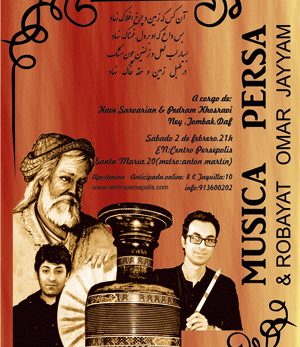 A cargo de: Kaveh Sarvarián & Pedram Khosravi Ney, tombak, daf Recital bilingüe persa-castellano de Rubayat Por: Gloria Garrido y Ahmad Taheri Kaveh Sarvarian: Músico y compositor. A parte de estudios académicos (master de Composición, Universidad de Arte de Teherán) ha...