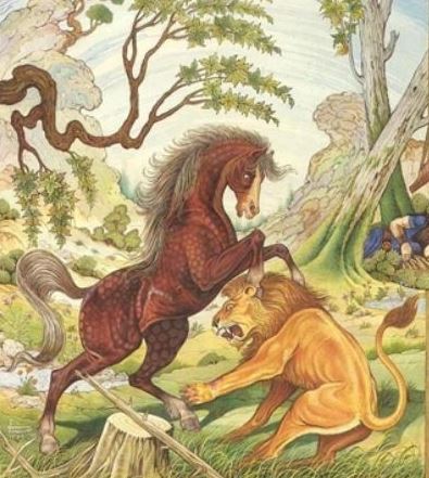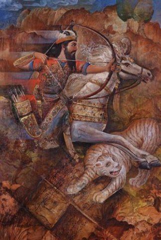 Rustam arroja su lazo real en torno al cuello del potrillo, pero la madre de Rakhsh lo ataca de inmediato. No obstante, Rustam hace huir de terror a la yegua al rugir como un león. Cuando por fin consigue capturar a Rakhsh e intenta doblegar su lomo con la mano, el caballo no se mueve, ajeno a la inmensa presión ejercida sobre su cuerpo. Después de montar a Rakhsh, Rustam pregunta al viejo palafrenero el precio del caballo. Este le dice que el caballo vale igual que todo Irán; así, si él es Rustam, debe ir a rescatar el país de Irán de manos enemigas y liberarlo de su tristeza. De este modo, Rakhsh se mantiene como fiel siervo y compañero de Rustam hasta que el hermanastro de éste mata a ambos.”