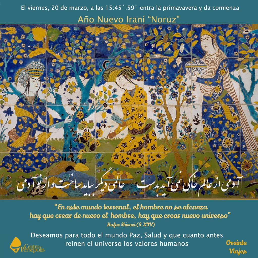 En armonía con el renacimiento de la naturaleza y según una tradición de la época de Zoroastro, el Año Nuevo Persa comienza el día de «Noruz», el primer día de la primavera. En realidad, esta fiesta se celebra en varios países como Tayikistán, Afganistán, Azerbaiyán, Uzbekistán, Turkeministán, Paquistán, partes de La India, Turquía y algunos países de Asia Central. Los ceremonias de Noruz son representaciones simbólicas de dos conceptos antiguos: Fin y Renacimiento. El origen documentado de la celebración se remonta a las fiestas que celebraban los reyes aqueménidas hace más de 2500 años en los palacios de Persépolis, en el sur del país.. Noruz fue reconocido y llamado oficialmente por el emperador persa, Ciro el Grande (caracterizado como Shah Yamshid en mitología). Él fundó el primer imperio en la región y construyó el complejo Persépolis, y más tarde Takhte Yamshid (Trono de Yamshid) en la ciudad de Shiraz, reunió los iraníes y formaron el primer Imperio del mundo. Los reyes sucesores siguieron el mismo camino y presentaron la celebración de Noruz en Babilona, Egipto y Etiopía. “Noruz” en persa significa “Nuevo Día” y trae esperanza, paz y prosperidad al mundo.